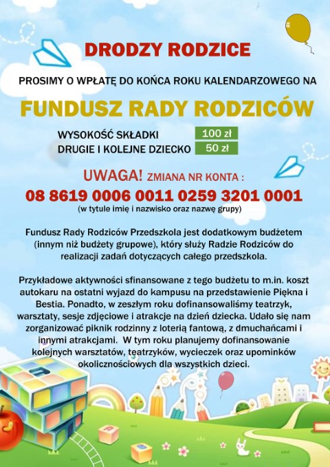Bardzo dziękujemy za danie nam możliwości angażowania się na rzecz naszych Pociech. Wszelkie wpłaty na konto Rady Rodziców i comiesięczne regularne składki, dzięki którym możemy jeszcze lepiej działać.